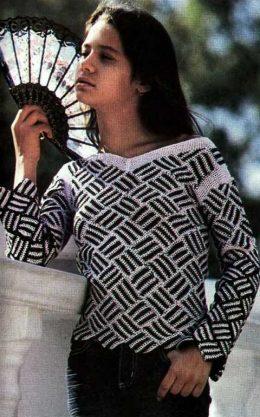 Пуловер с плетенкой РАЗМЕР 36 ВАМ ПОТРЕБУЕТСЯ • по 200 г черной и сиреневой пряжи (47% вискозы. 53% хлопка. 430 м/100 г) • крючок № 2 Квадраг. связать це...