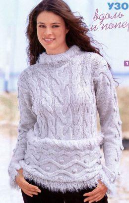 Серый пуловер с «меховой» отделкой Размеры: 34/36 (38/40) Вам потребуется: 500 (550) г светлосерой пряжи Superlana (100% мериносовой шерсти, 110 м/50 г)...