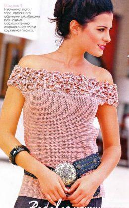 Топ с кружевной Размеры: 34/36 (40/42) 44/46 Вам потребуется: 250 (300) 350 г розовой пряжи Bingo Linie 163 (100% хлопка, 125 м/50 г); 100 г розовой мела...