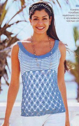 Топ с полосатой кокеткойвязание крючком Размеры: 36/38 (40/42) Вам потребуется: 200 (250) г бирюзовой и 50 г белой пряжи Linie 134 Candy (100% хлопка. 156 м/50...