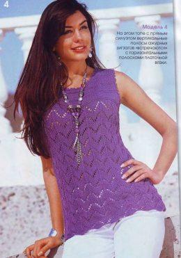 Топ с ажурными зигзагами Размеры: 36/38 (40/42) 46/48 Вам потребуется: 300 (350) 350 г лиловой пряжи Мало (90% хлопка, 10% полиамида. 140 м/50 г); спицы № 5: кр...