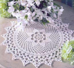 Белая вязаная салфетка Диаметр 31 см Вам потребуется: 40 г белой хлопчатобумажной пряжи (200 м/50 г); крючок № 1,5 - 1,75 Описание работы: связать цепочк...