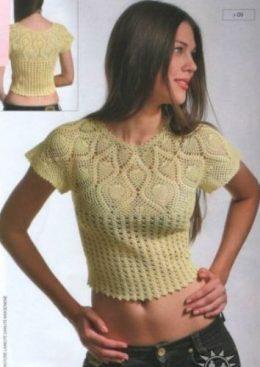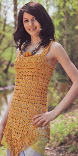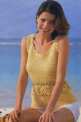 Желтый топ вязаный крючком Красивый удлиненный топ желтого цвета Для вязания топа вам понадобиться 350г желтой пряжи (100% х/б, 50г/127м) Крючок №4, 1 па...