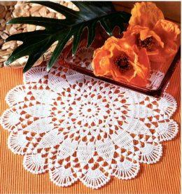 Салфетка с декоративным узором из листьев Размер: диаметр 35 см. Материалы: 50 г белой хлопчатобумажной пряжи (200 м/50 г) Крючок № 1,5-1,75 Описание работы Свя...