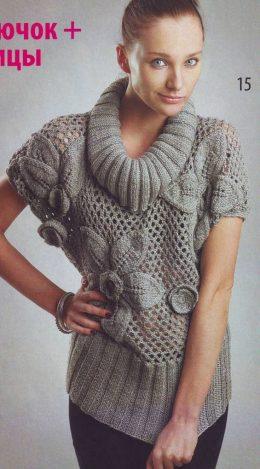 Вяжем серый пуловер с цветами Размеры: 36-40 Вам потребуется: пряжа DUODE NICOLE (70% шерсть, 30 % акрил, 100 м/50 г) - 500 г серого цвета, спицы № 3, крючок №...