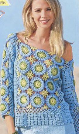 Пуловер с круглыми мотивами Размеры: 38/40 (42/44) Вам потребуется: 350 (400) г бирюзовой, 150 г желто-зеленой, по 50 г зеленой и синей пряжи Club (50% х...