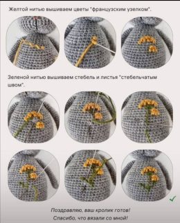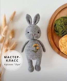 Мягкий серый кролик, связанный крючком с особым вниманием к деталям, украшен аккуратной вышивкой желтых цветов на животике. Его выразительные черные глазки и ма...