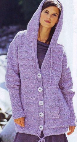 Жакет с капюшоном вязание спицами Размеры: 38/40 (42/44) Вам потребуется: 1100 (1150) г лиловой меланжевой пряжи Eve Color (44% шерсти, 43% полиакрила, 13% поли...