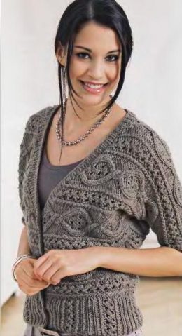 Короткий жакет с узором из кос спицами Размеры: 36/38 (42/44) Вам потребуется: 400 (500) г пряжи цвета антрацита Merino Mix (51% мериносовой шерсти, 49%...
