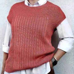 Уникальный вязаный жилет глубокого бордового цвета выполнен из мягкой пряжи с выразительным центральным узором из кос. Акцент на объемных плетениях и аккуратной...