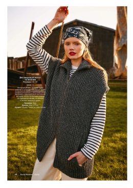 Этот жилет выполнен из мягкой коричневой пряжи с выразительным ажурным узором, создающим эффект объемных листьев и кос. Особенность модели — плотный резиновый к...