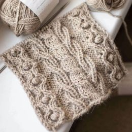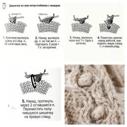 Данный образец вязания выполнен из мягкой пряжи натурального оттенка, украшен выразительными объемными шишечками по краям и сложным плетеным центральным узором. Уникальное сочетание кос и рельефных элементов придает изделию глубину и оригинальность, делая его идеальным для создания стильных свитеров и аксессуаров с выразительной фактурой.