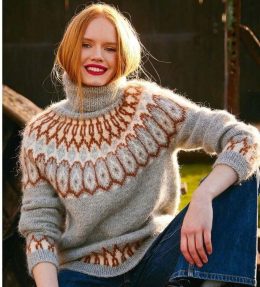 Этот свитер выполнен из мягкого мохера и украшен изысканным скандинавским узором, который придает ему уникальность и стиль. Высокий воротник и узоры на манжетах создают уют и защищают от холода, делая его идеальным для прохладных дней.