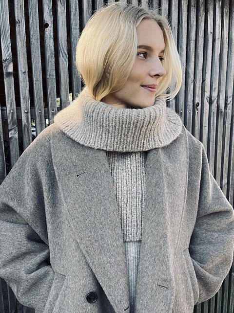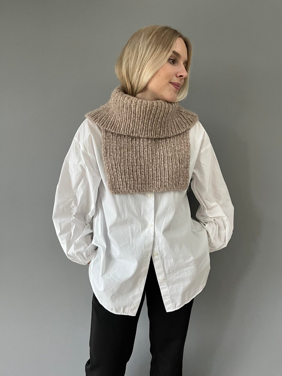 Этот свитер связан спицами из мягкой пряжи с выразительным крупным узором, который напоминает уютные зимние вечера у камина. Особенность модели — широкий высокий воротник, который можно носить как снуд, создавая дополнительный комфорт и стиль. Идеально подойдет для холодных дней, сочетая практичность и элегантность.