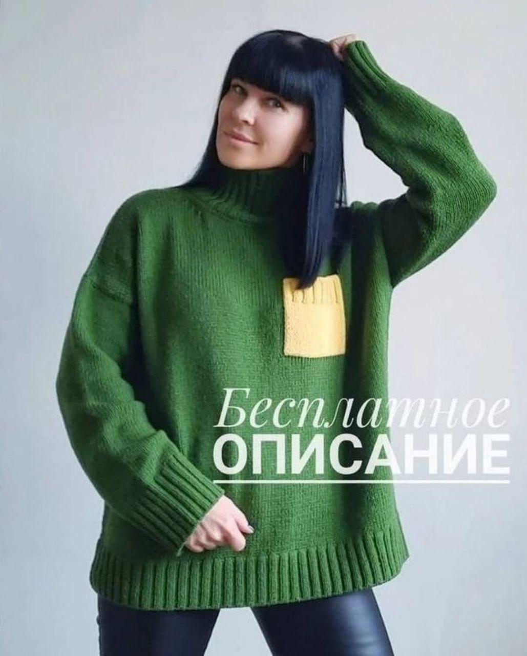 Объемный свитер с высоким воротником и ярким акцентом в виде контрастного кармана — идеальный выбор для холодных дней с ноткой игривости и уюта.