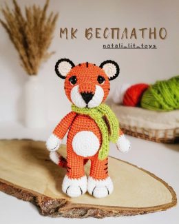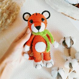 Когда модный мир заявляет, что ‘оранжевый — новый чёрный’, этот милый тигрёнок говорит: ‘Да, и что дальше?’ С зелёным акцентом в виде шарфика, этот малыш готов занять лидирующее место в вашей коллекции вязаных игрушек. Но будьте осторожны: этот сладкий тигр может украсть все ваши комплименты!