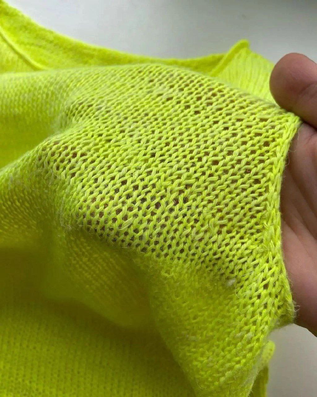 Связанный спицами топ нежно-салатового цвета с аккуратным краем и ровной текстурой, отлично подойдет для теплого сезона. Уникальная вязка делает изделие воздушным и комфортным.