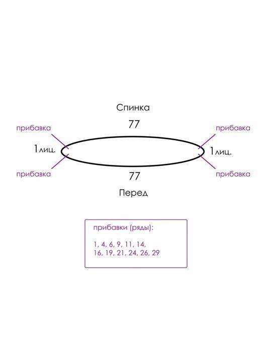Прибавки выполняла по 2 с каждой стороны в соответствии со схемой (см.фото). Всего сделала 24 прибавки по правому боку и столько же по левому. С 32 ряда вязание разделила на Перед и Спинку. Для формирования проймы Рукава, выполнила 15 убавок. Вывязывать горловину по Спинке начала с 100 ряда (5 точек разворота).