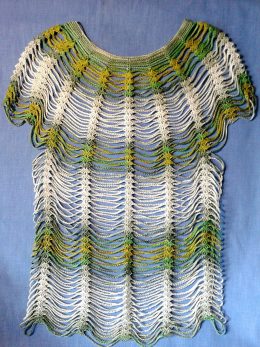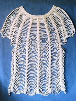 Связала на заказ по фотографии из интернета топ с протяжками из пряжи заказчицы — белый хлопок с вискозой ORION (170 м/50 г), потом повторила модель себе из секционно окрашенного акрила DIVA. Расход пряжи на топ 110-120 г, крючок 3.