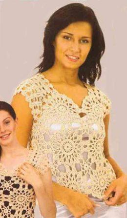 Сборка: отпарить изделие. Обвязать вырез горловины, проймы и низ изделия 3-им рядом по схеме 3. Топик из мотивов. По материалам журнала «Da!»