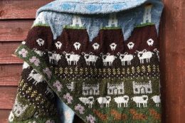 Трогательный момент спицами: Этот великолепный плед сочетает в себе уникальные узоры с изображением домиков и овечек, создавая уютную атмосферу сельской идиллии.