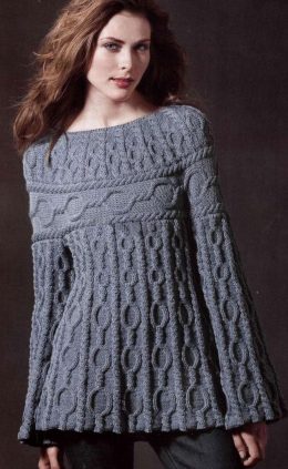 Горизонтальная кокетка: наберите 30 п. и вяжите 2 лиц. (кром. п. провязать обратной трикотажной петлей, т. е. в лиц. рядах вязать с накидом, а в изн. рядах вязать лиц. петли), 4 п. узором «маленькая коса», 18 п. узором «большая коса», 4 п. узором «маленькая коса», 2 лиц. п.( кромочные провязать обратной трикотажной петлей, т. е. в лиц. рядах вязать с накидом, а в изн. рядах вязать лиц. петли). Вяжите до 30-го ряда узором «большая коса», не включая убавления в 30-м ряду. Провяжите с 1-го по 30-й ряды узора «большая коса» 11 (12/13) 14 раз, не включая убавления петель в 30-м ряду. Закройте все петли.