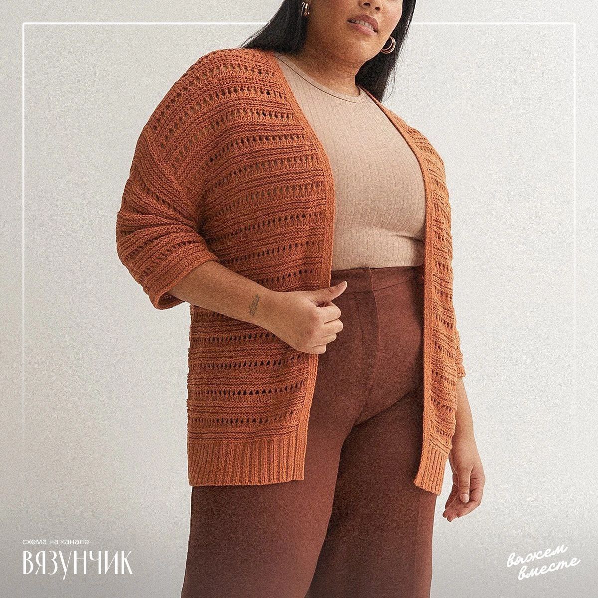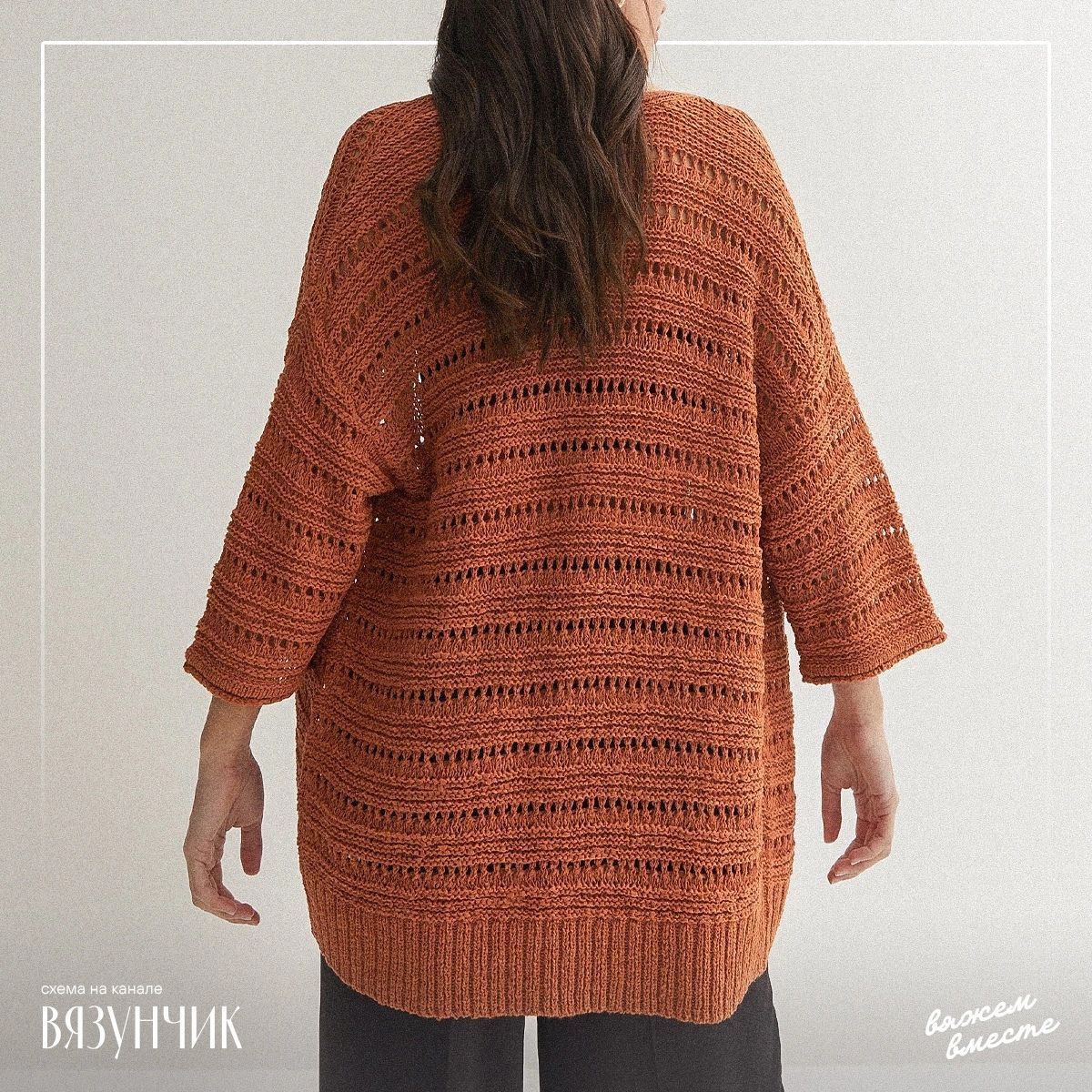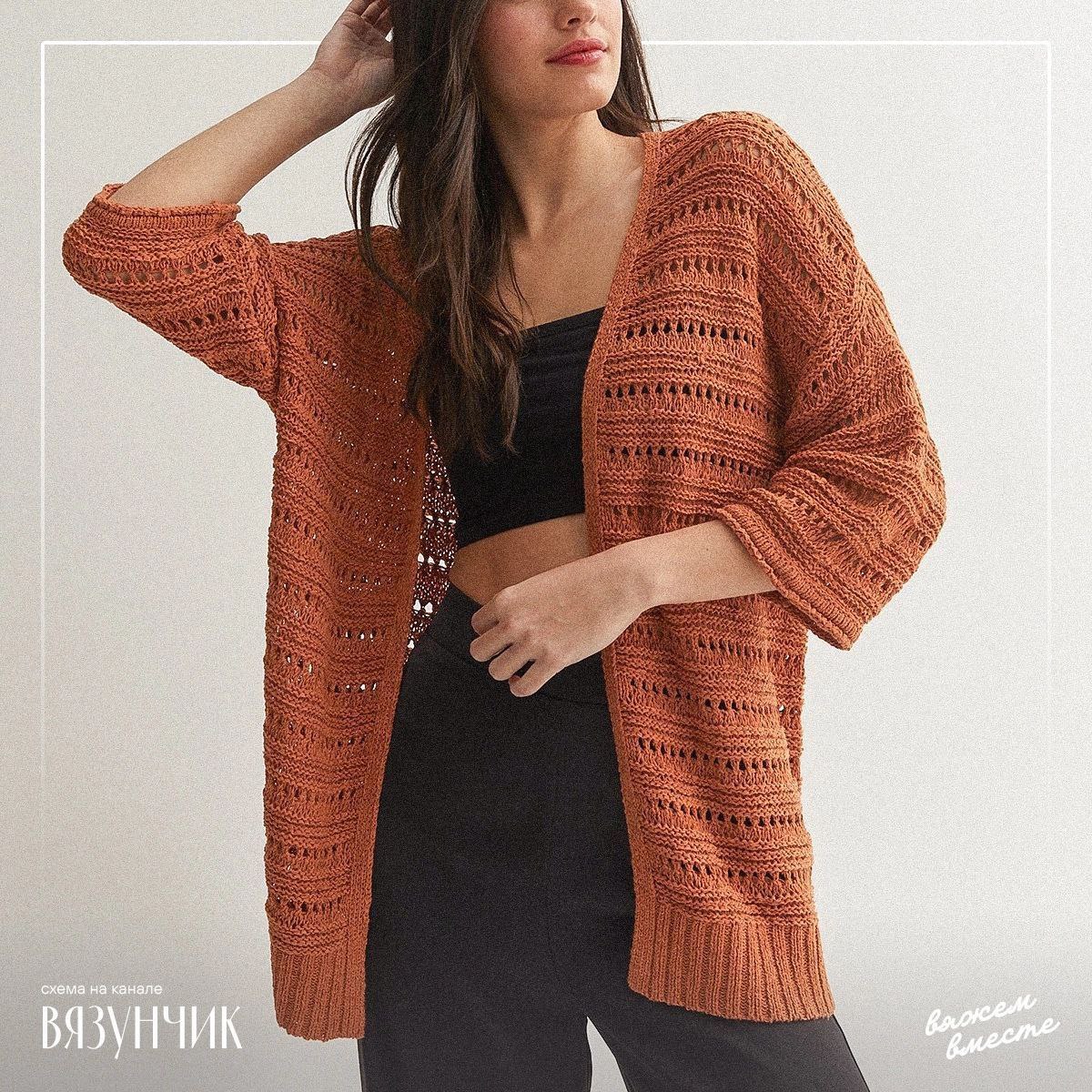 Этот рукотворный кардиган выделяется уникальной техникой вязания с использованием сложных переплетений и декоративных отверстий, создающих эффектный текстурный узор. Особенность — сочетание тонких нитей и объемных рельефных вставок, придающих изделию необычную глубину и динамику. Идеально подходит для стильных образов и подчеркивает индивидуальность.