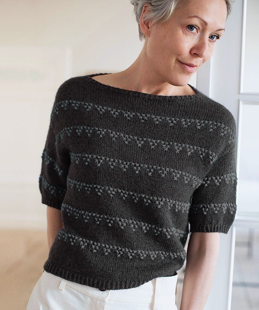 Топ с элегантным сдержанным узором. Размеры 1 (2) 3 (4) 5 (6) 7 (8) 9 (10) Окружность груди 89 (93) 98 (104) 109 (115) 120 (125) 131 (136) см Длина: 54 (55) 56 (57) 58 (59) 60 (61) 62 (63) см Спицы круговые спицы: 3 мм и 3.5 мм. Пряжа. Isager в цвете Лён (50 % лён, 30 % хлопок, 20 % лиоцель; 175 м/50 г) Alpaca 1 от Isager в цвете E6S (100 % альпака; 400 м/50 г) – по одной нити каждой пряжи, сложенных вместе. Перевод описания 150р.