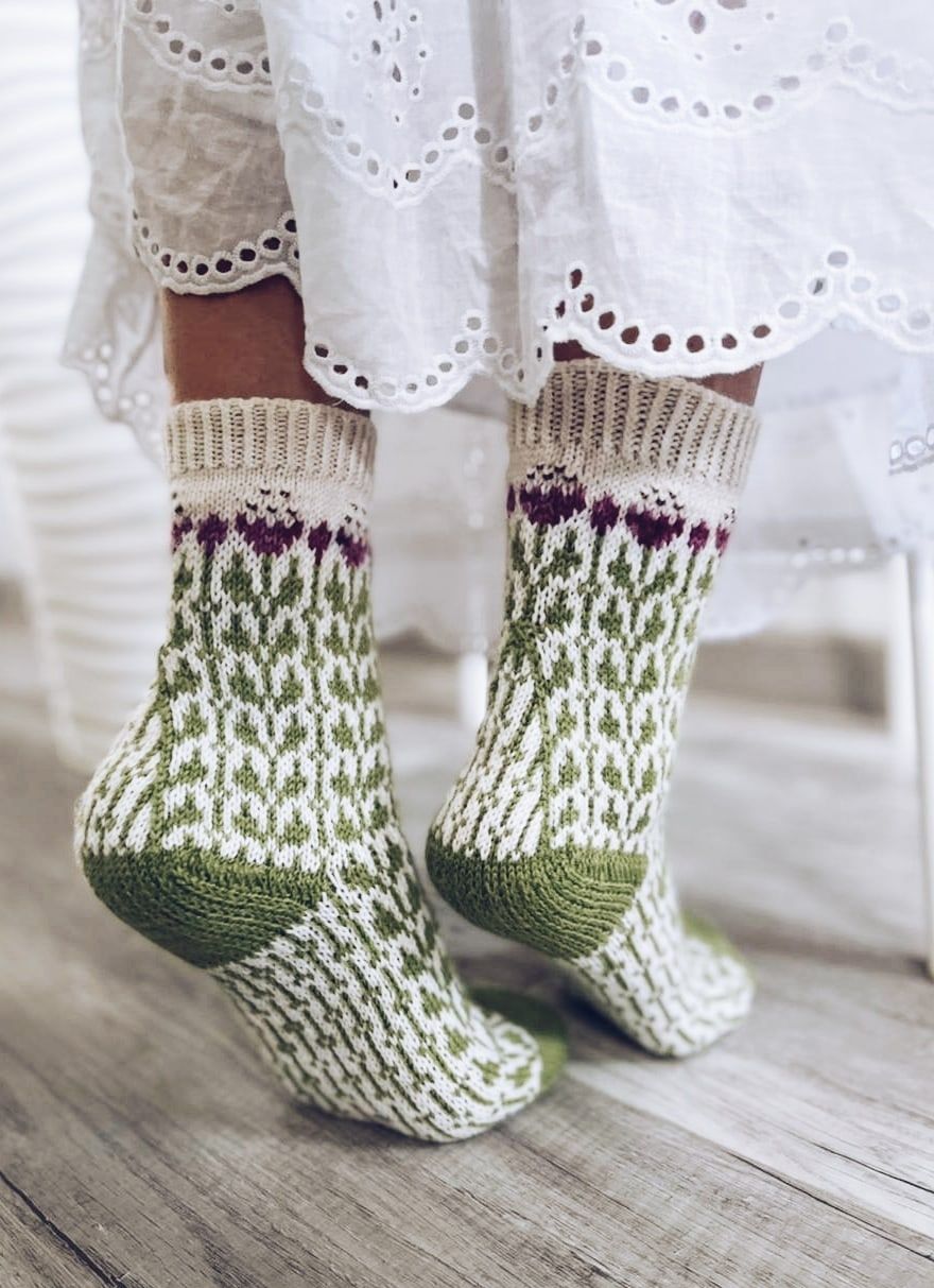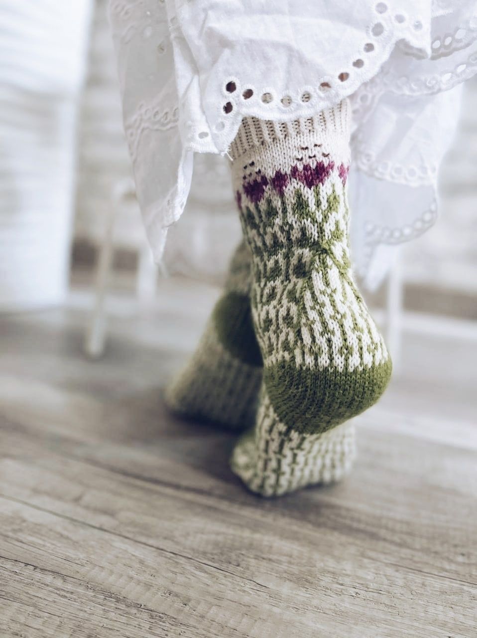 Эти носки так уютны, что даже кот решил их не трогать — видимо, почувствовал магию зелёных листочков и бордовых бутонов. Вязаные из мягкой пряжи, они согреют ноги и поднимут настроение в любой день. Особенность — аккуратная резинка и оригинальный растительный узор, который не повторится ни у кого другого.