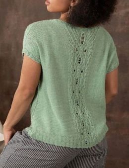 Уютный джемпер с короткими рукавами и оригинальным узором из мелких треугольников, создающих ритмичные горизонтальные полосы. Модель выполнена спицами из мягкой...