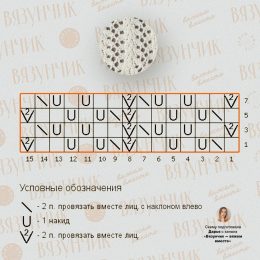 Раппорт узора состоит из восьми петель по ширине и четырех рядов по высоте. НО если вы вяжете не один раппорт, то для каждого следующего прибавляете 7 петель, а не 8.