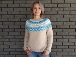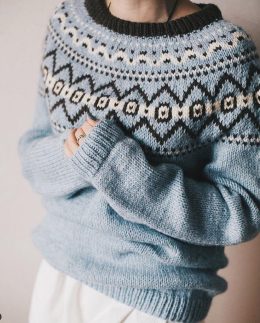 Тёплый свитер с уникальным узором, выполненный в мягких оттенках голубого, идеально подходит для холодных дней.