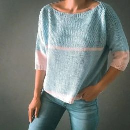 Уникальные детали включают сочетание голубого и розового цветов, а также оригинальный узор вязки, который придаёт изделию изысканный вид. Этот свитер идеально подходит для прохладных вечеров, добавляя уют и стиль вашему образу.
