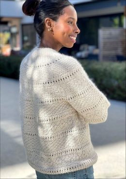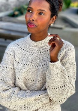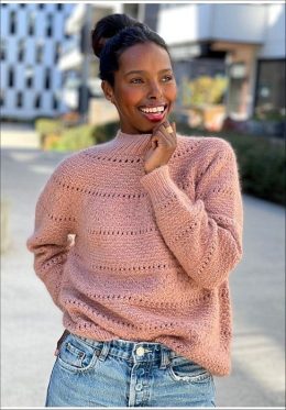 Этот вязаный свитер с неожиданно нежным розовым цветом привлекает внимание своей текстурой. Акцент на ажурных полосах и свободной посадке делает его особенно уютным и стильным.