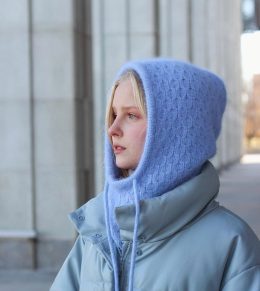 Мягкий капор нежно-голубого цвета с контрастными полосами и прозрачными вставками, создающими воздушный и стильный образ. Идеально согреет и дополнит повседневн...