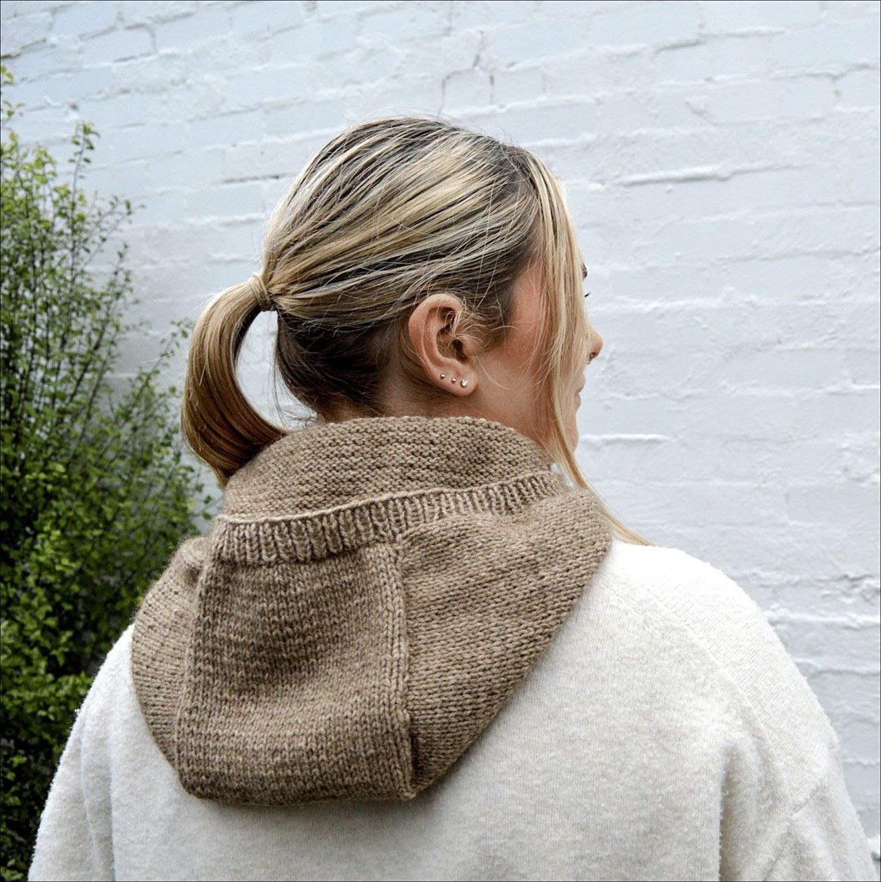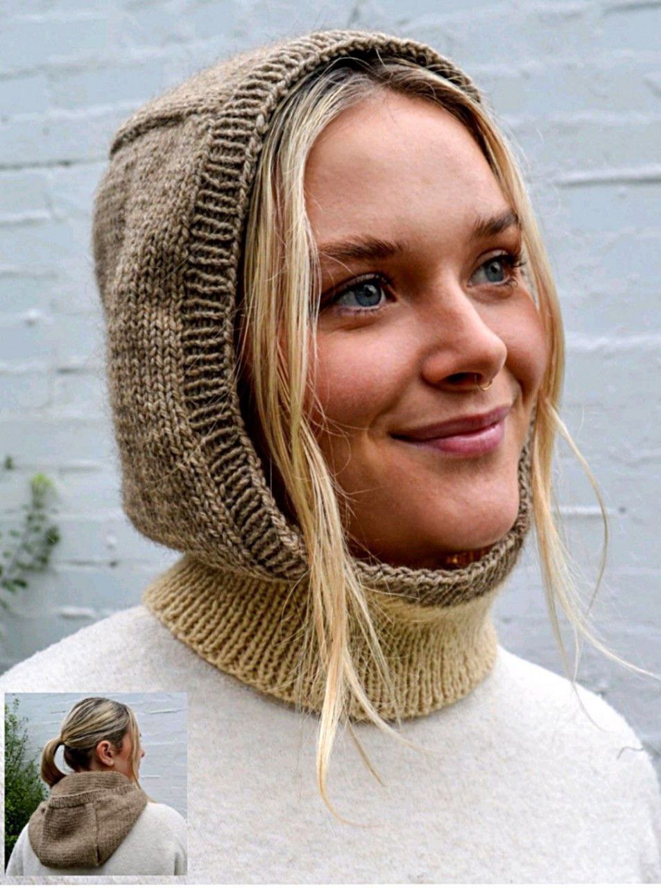Уникальный вязаный капюшон с двухцветной текстурой и объемным краем, создающим эффект объемной рамки.
