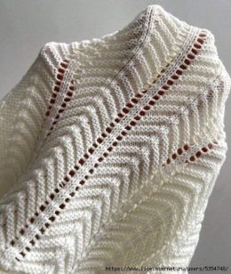 Элегантная вязаная спицами шаль с изящным узором в виде перьев, дополненная ажурной каймой. Уникальная форма и воздушная структура делают изделие легким и эффек...