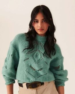 Связан спицами из мягкой пряжи с эффектом мохера, этот свитер выделяется крупным ажурным узором в центре и на рукавах, создавая легкую прозрачность и воздушность. Особенность модели — свободный крой с объемными рукавами и резинкой на манжетах, что придает изделию стильный и современный вид.