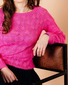 Какое чудесное творение! Этот ярко-розовый свитер, связанный спицами, поражает своим изысканным узором. Восхитительные ажурные детали и идеально подобранный цвет делают его настоящим шедевром ручной работы.