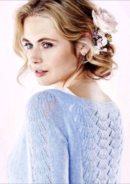 Женский пуловер связан из тонкой кашемировой пряжи голубого цвета. Багодаря особой ажурной вязке изделие выглядит нежным и невесомым, как паутинка.