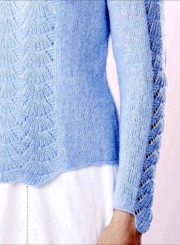 Ах, какая прелесть, правда? Этот нежно-голубой свитер, связанный спицами, просто завораживает! Вы только посмотрите на этот изысканный ажурный узор, который напоминает легкие перышки. А рукава — какая красота, с этими аккуратными деталями, придающими образу легкость и романтичность. Просто восхитительно!