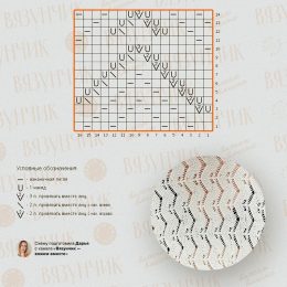 На схеме 1 раппорт — 16 петель и 14 рядов. Здесь все ряды при вязании по кругу. Чтобы вязать поворотными рядами, замените лицевые петли на изнаночные, а изнаночные на лицевые в четных рядах.