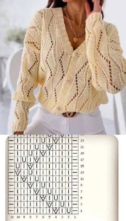 Посмотрите на это очаровательное вязаное изделие! Свитер выполнен из мягкой пряжи, которая создаёт узор, напоминающий волны. Особое внимание привлекают изящные ажурные линии и аккуратные пуговицы, добавляющие шарм и индивидуальность. Этот свитер станет отличным дополнением к вашему гардеробу — согласны?