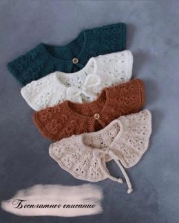 Эти очаровательные воротнички связаны спицами и украшены аккуратными пуговицами. Узоры создают эффект легкости и нежности, а завязки добавляют практичности и стиля.