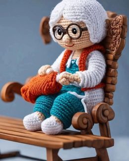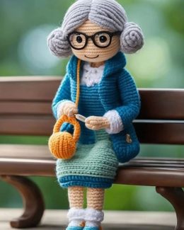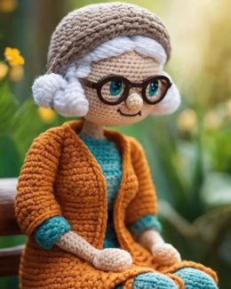 Эта очаровательная кукла, сделанная вручную, напоминает о теплых бабушкиных вечерах. Ее яркий оранжевый кардиган и большие очки придают образу особый шарм.