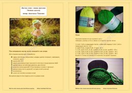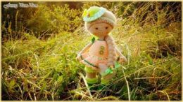 Очаровательная вязаная кукла, облаченная в пастельное платье с акцентом на зеленые и оранжевые тона. Детали одежды включают стильное платьице с кружевами и элегантную шляпку, украшенную цветком. Плетеная коса добавляет изысканности, подчеркивая рукотворный шарм изделия.