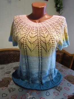 Здравствуйте, дорогая, взгляните на эту прелесть! Этот вязаный шедевр с ажурными узорами и градиентом от розового к голубому — настоящий хит сезона. Особенно очаровательны эти переходы цветов, словно закат на летнем небе.