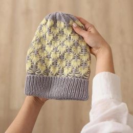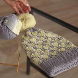 Серый ободок плавно переходит в узорчатую текстуру, где жёлтые и серые нити создают объёмный дизайн. Ручная работа подчёркивает внимание к деталям и мастерство в использовании цветовых сочетаний.