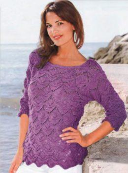 Вам потребуется: 450 (550)650 г сиреневой пряжи Capri (55% хлопка, 45% полиакрила, 105 м/50 г) спицы №4,5;крючок № 4.