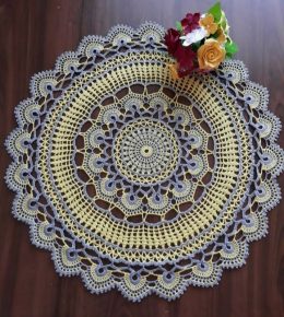 Начинается с тонкого узора в центре, этот вязаный крючком коврик впечатляет своей сложностью и изяществом. Желтые и серые нити переплетаются в изысканный орнамент, который напоминает солнечные лучи. Кружевные края придают изделию воздушность, а искусно выполненные цветочные мотивы добавляют очарования.